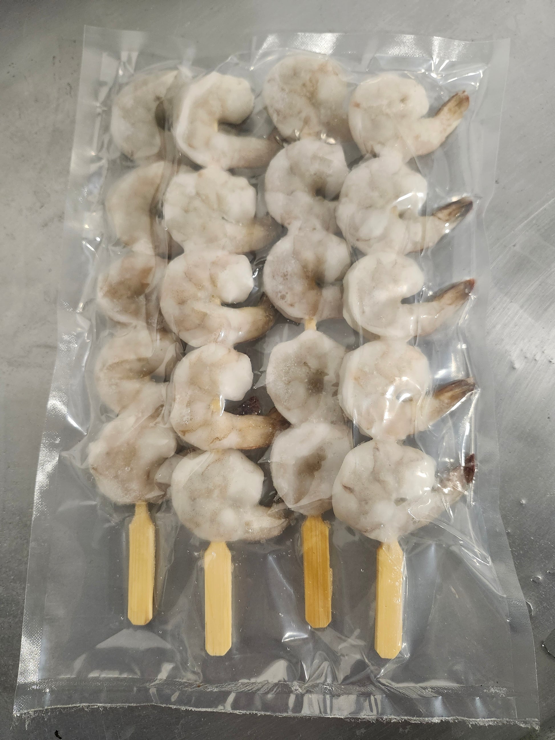 12 skewers, with 5 large uncooked shrimp per skewer. Great on the BBQ or cooked in the oven.